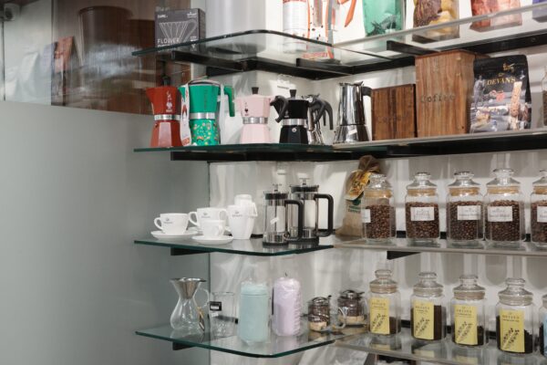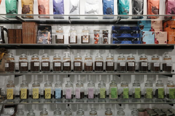 販売スペースには、コーヒー豆や紅茶のサンプル、コーヒーや紅茶を楽しむグッズ等がずらりと並んでいます。