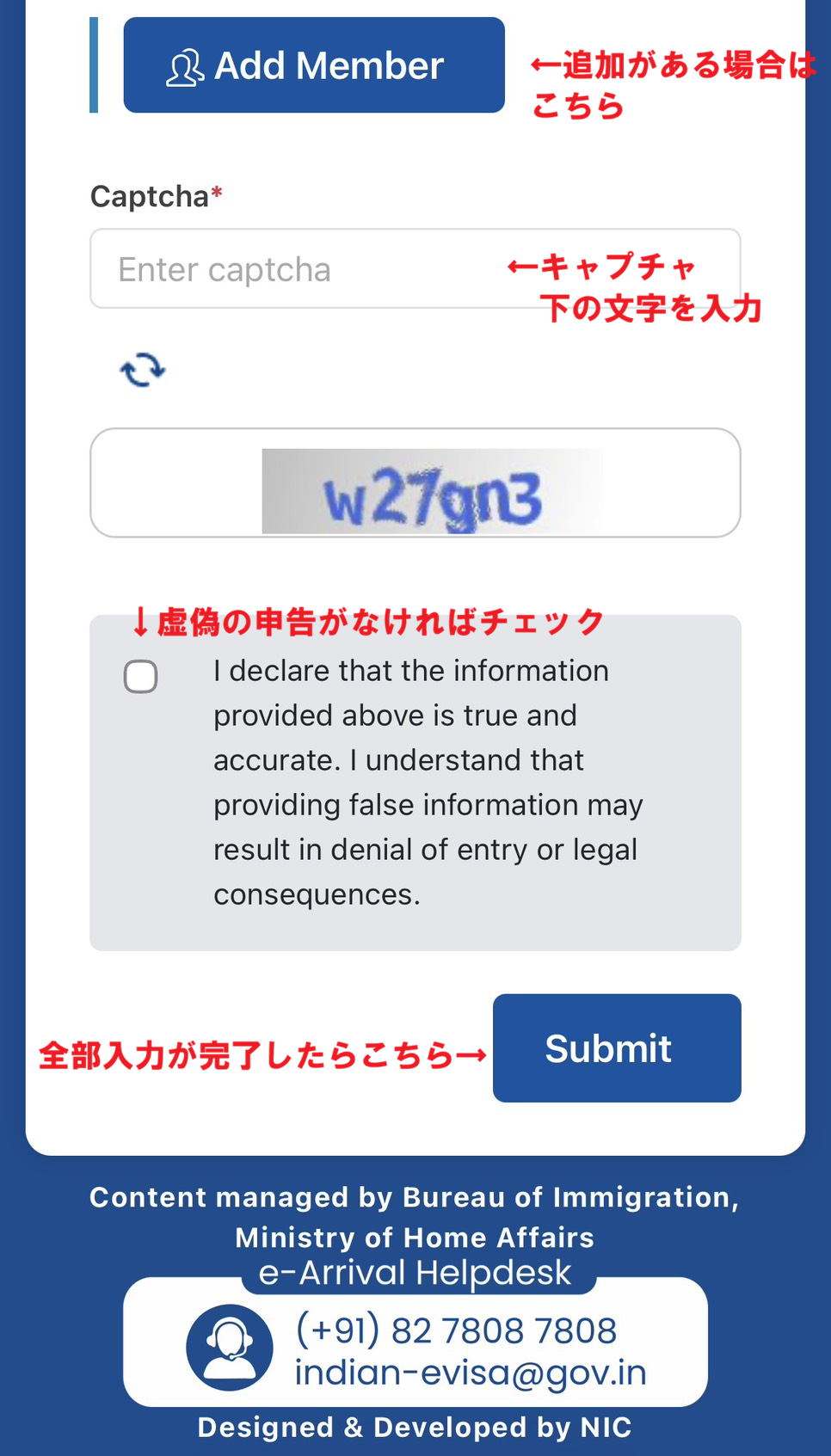 Captchaの文字を入力し、申請内容に虚偽がないことのチェックボックスにチェックを入れて、Submitを押せば完了です!