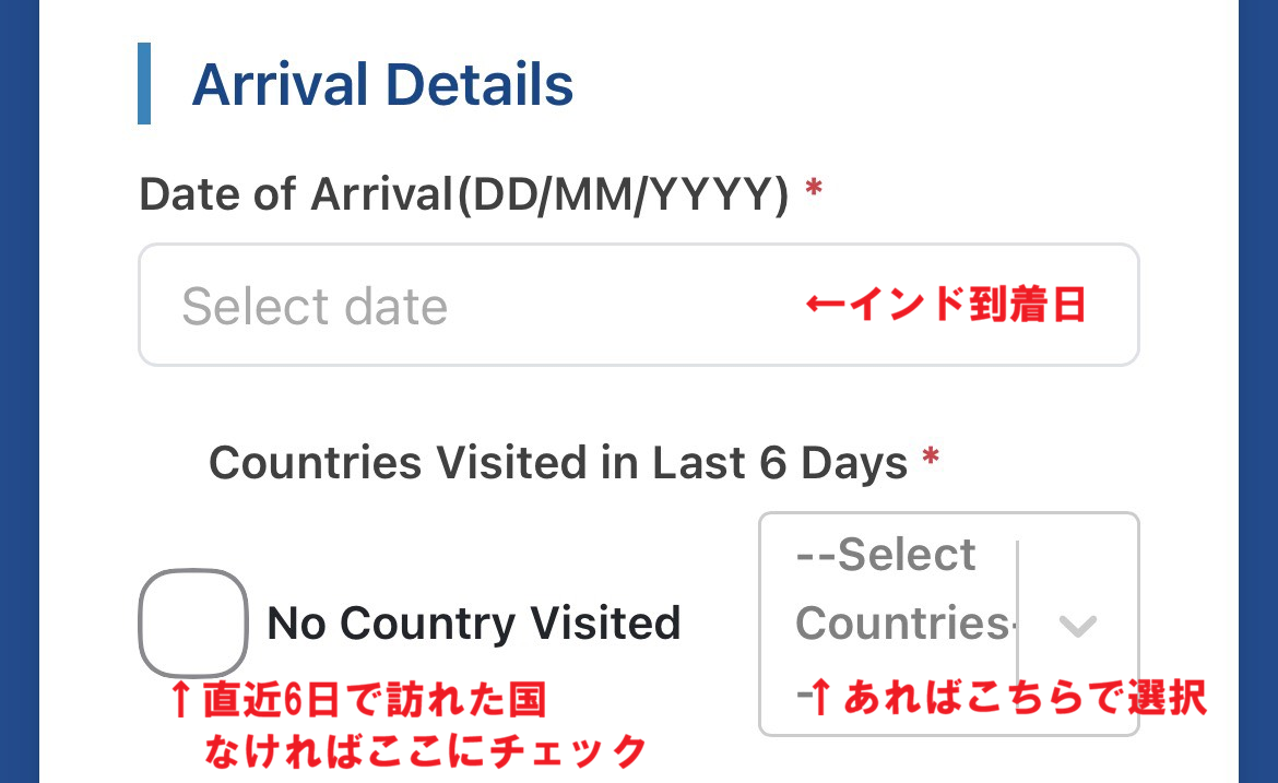 入国日と直近6日間に訪問した国を入力します。訪問した国がなければ「No Country Visited」を選択してください。