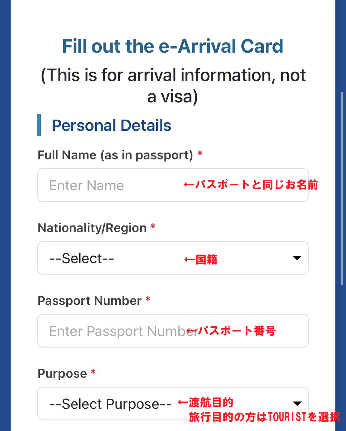 パスポートと同じ名前、国籍(JAPAN)、パスポート番号、目的(基本はTOURIST)を入力します。