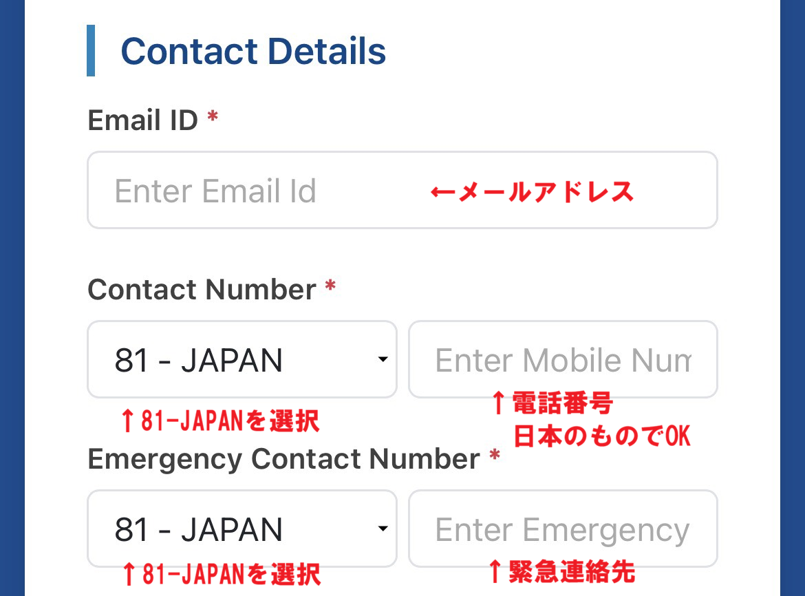 メールアドレス、電話番号(日本の番号でOK)、緊急連絡先を入力します。