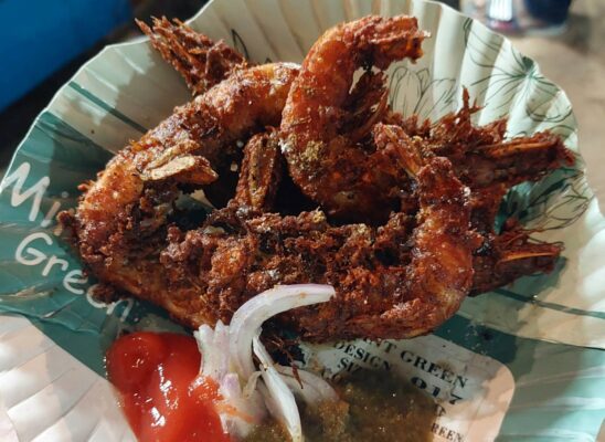 海老をカリッと油で揚げたフライは絶品。新鮮な海の幸を、砂浜で、波音を聞きながら食べる。ビーチでマーケット、最高です。