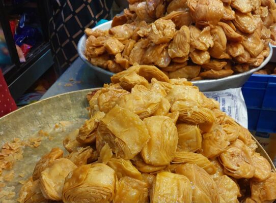 寺院周辺では、神様へのお供え物として使われる伝統菓子「カジャ」が至るところで売られています。何層にも折り重なったパイ生地で、かりんとうのような甘さが特徴。ギー(澄ましバター)で揚げたものは、バターの風味も感じられてとても美味しいです。お店の人が味見もさせてくれるので、ぜひ試してみてほしいです。