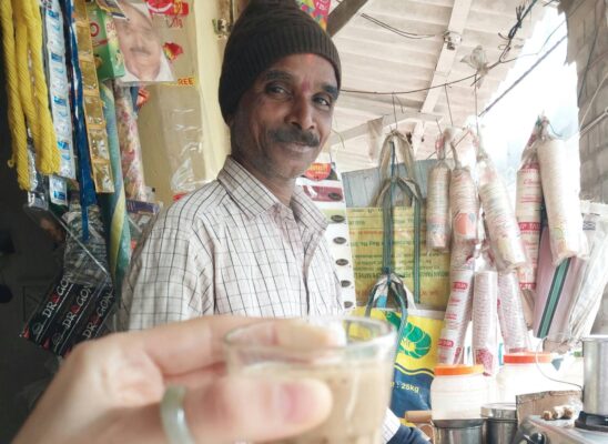 少し早起きをして、サンタナロッジからビーチまで散歩に出かけます。徒歩15〜20分ほどの道のりです。途中、小さな茶屋で朝チャイを一杯。プリーのチャイはミルクが濃いめで、スパイス感も強めです。
