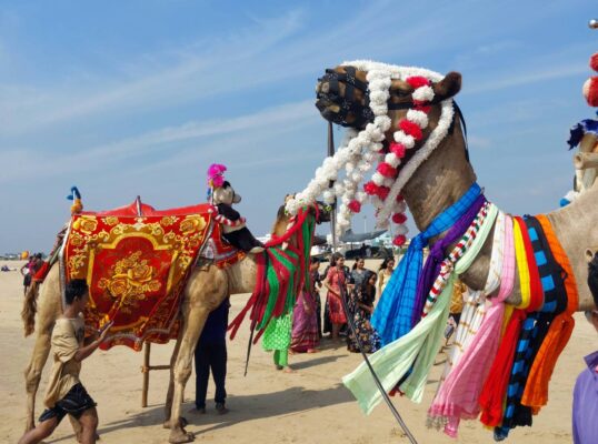 ビーチに到着すると、まだ人も多くなく、インドの人々がバケーションを楽しんでいる様子が見られます。穏やかな波音が心地よく、カラフルに着飾ったラクダが砂浜を歩いている姿も印象的でした。わずか100ルピーでラクダに乗れるので、気になる方はこの機会にぜひ挑戦してみては。
