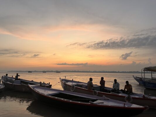 バラナシに来ていただいたら間違いなく体験していただきたいのが、ガンジス川からボートに乗って眺める朝陽になります。冬の霧に包まれた幻想的な雰囲気も良いですが、この時期のパキッと乾いた空気は遠くのガート(階段状の岸辺)まで見渡せる潔さがあり、感動します。